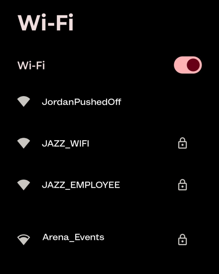 公牛官方晒出了爵士主场球馆的公共WIFI图片,其中有一个WIFI的名称为“乔丹推人了”。