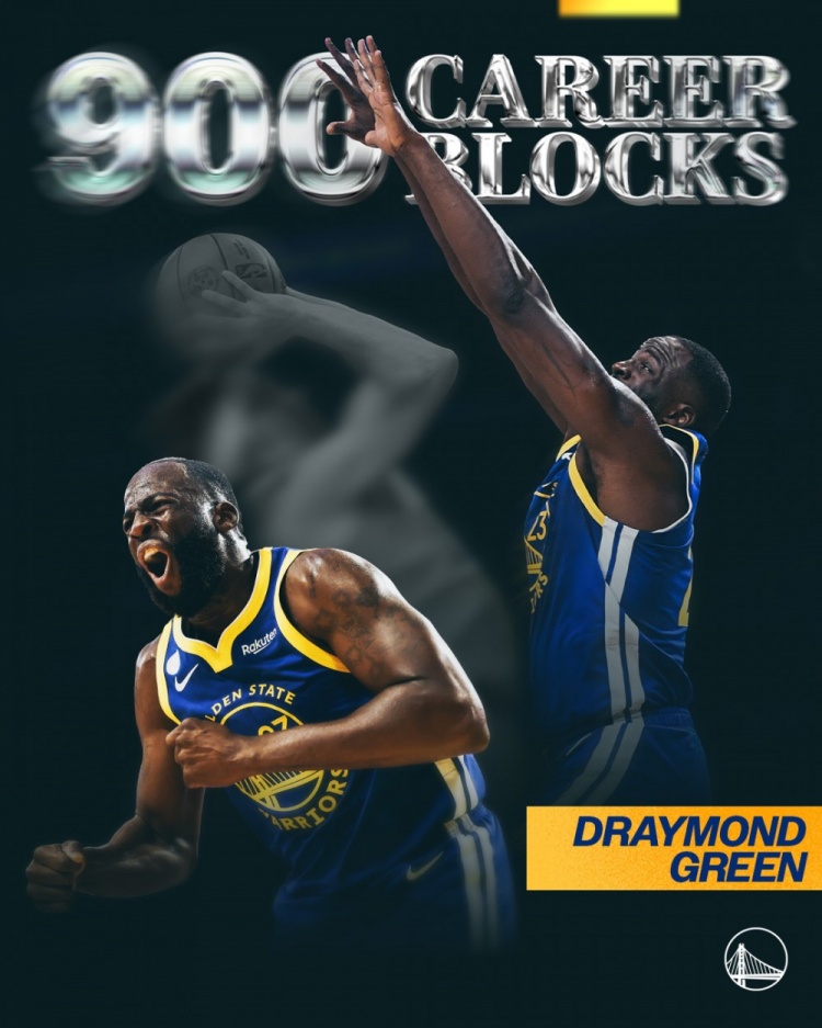 至此,追梦解锁了职业生涯第900个盖帽的里程碑,成为勇士队史第二位盖帽数达到900个的球员。