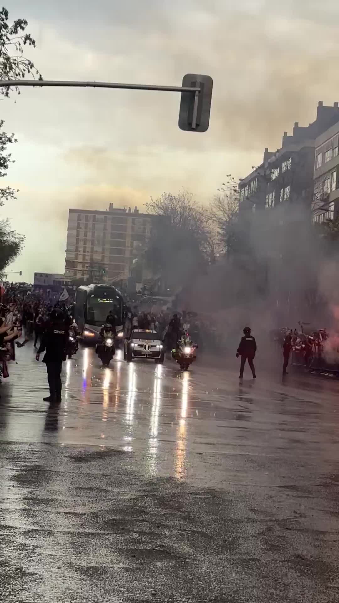皇马大巴在球迷的簇拥中前往伯纳乌,一名裸男从大巴前跑过